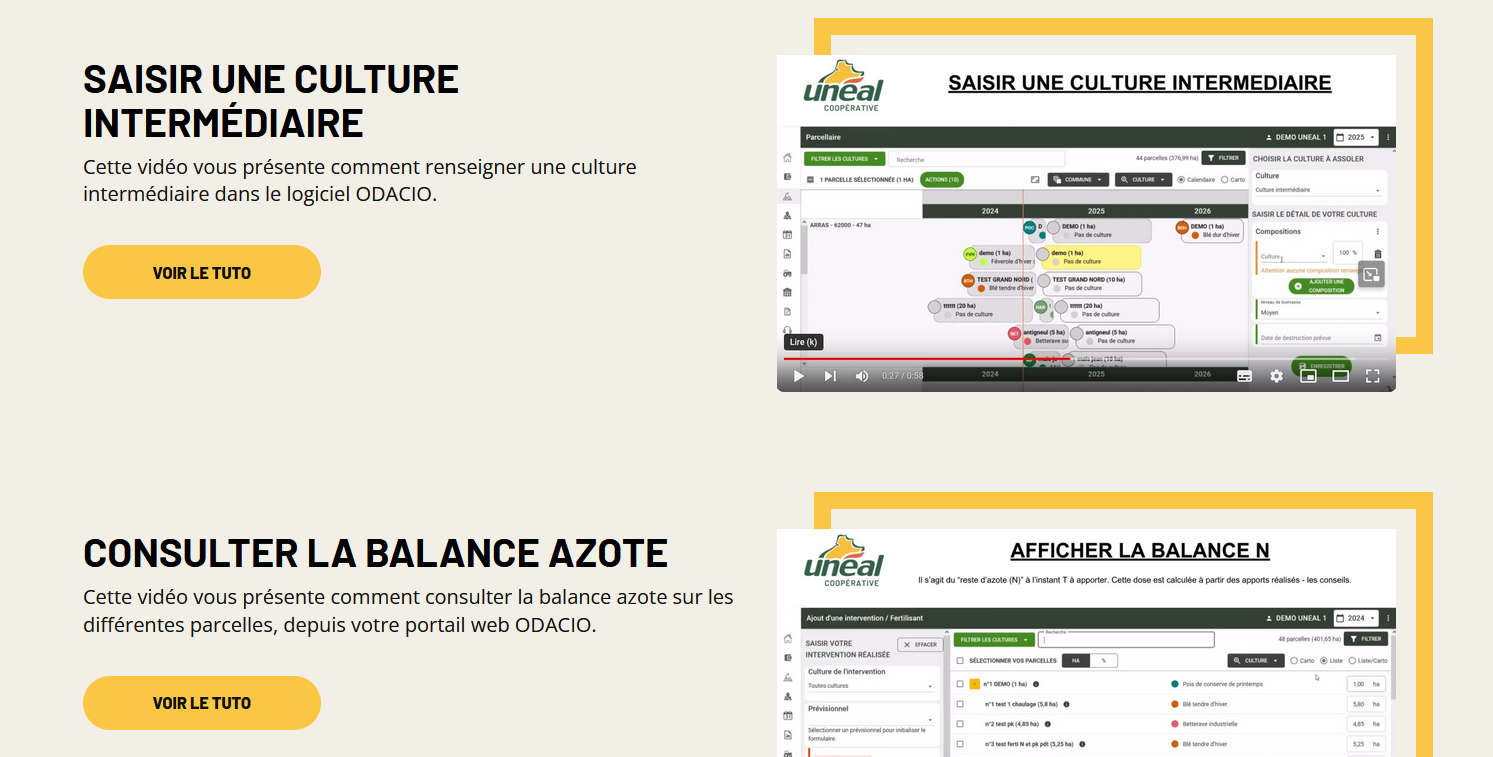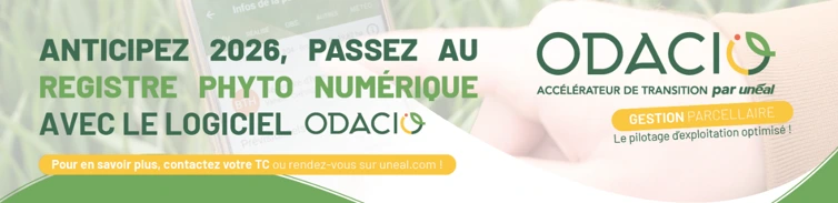 - Le logiciel ODACIO est inclus dans l’ensemble des offres d’accompagnement et services d’Unéal (ODACIO Pilotage des intrants, Sérénité, Pomme de terre…). Profitez du logiciel gratuitement (ou optez pour le logiciel seul, à seulement 300€/an pour le module standard)