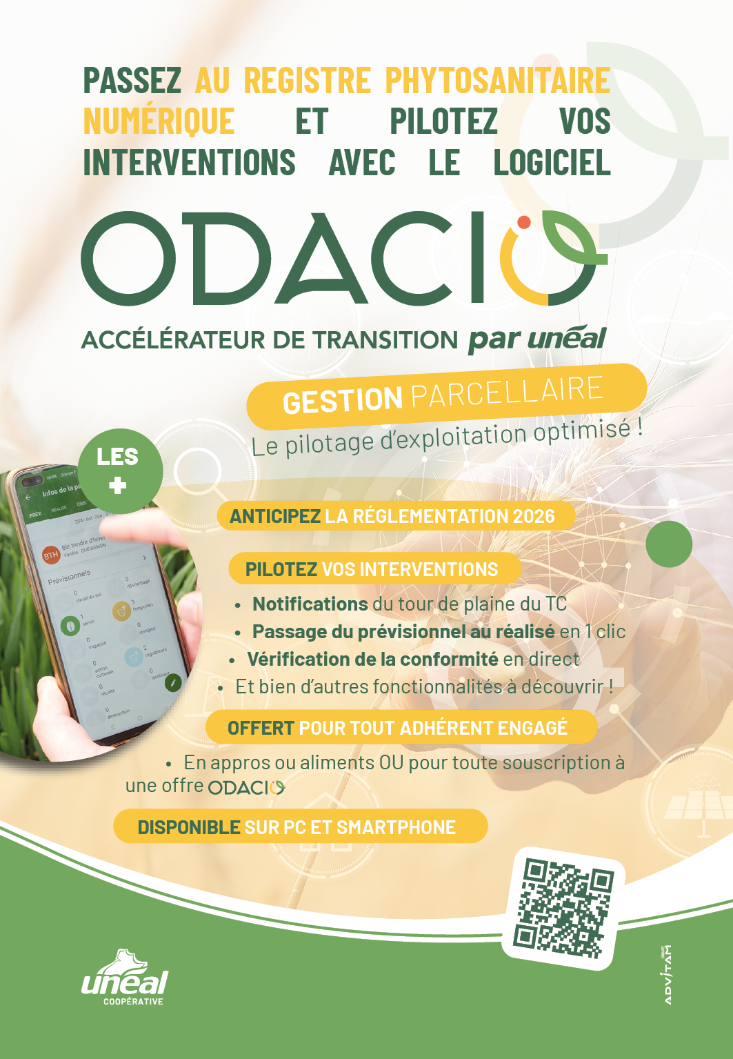 La solution ODACIO est clé en main et GRATUITE pour l’ensemble des adhérents ayant un contrat « jeune coopérateur », un Contrat Coopérateur Appros ou Aliments, ou une offre d’accompagnement ODACIO pour la campagne 2025-2026.